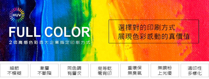 只能使用 UV 印刷,但 HUV 印刷比傳統 UV 更顯色且沒有塑料油墨的刺鼻味 - 壓紋的美術紙/無塗佈的模造紙類: